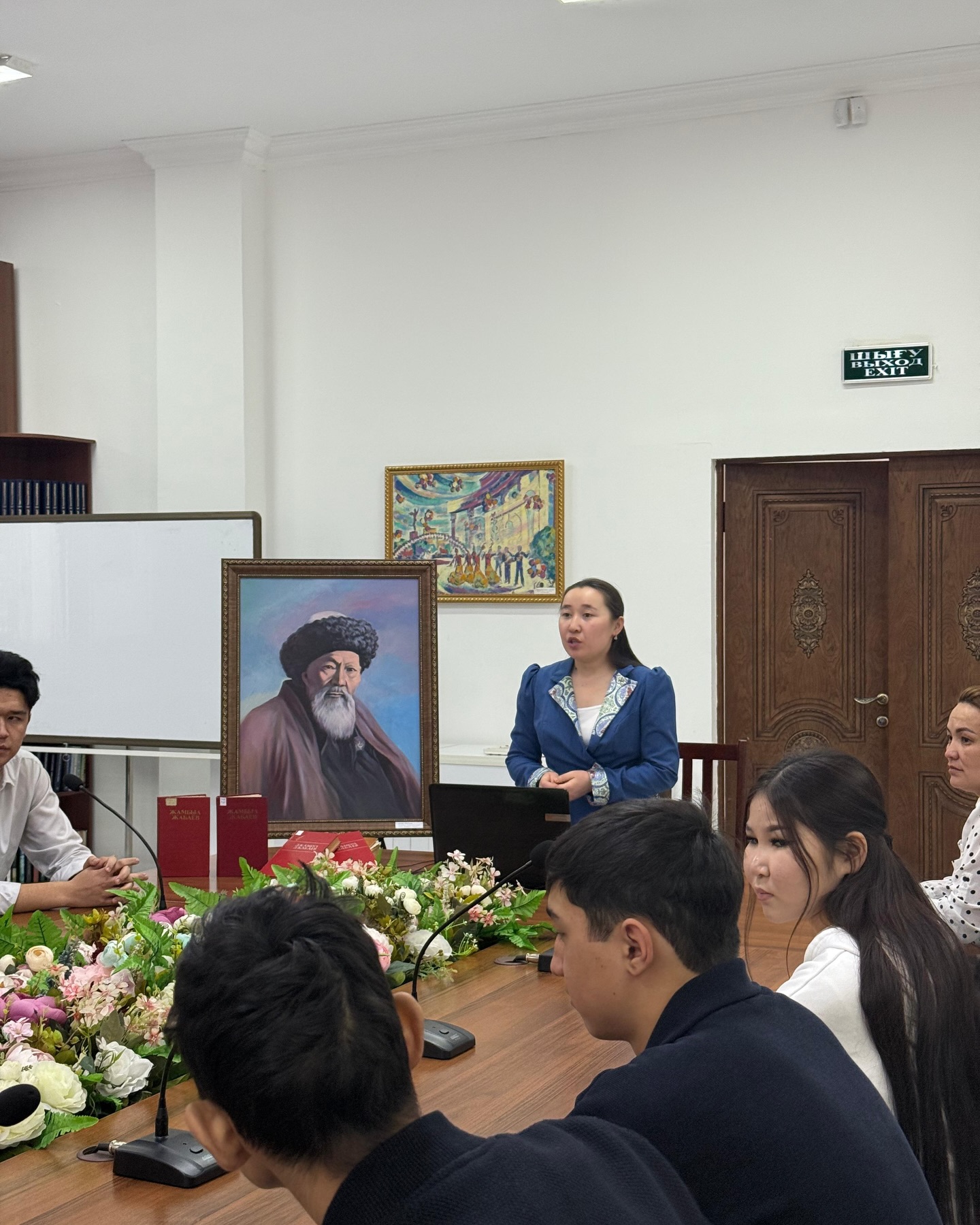 Музей сабағы барысында облыстық тарихи-өлкетану музейінің кітапхан қорында сақталған Жамбыл Жабаевтың кітаптары,майлы бояумен салынған портретімен танысуға мүмкіндік алды.